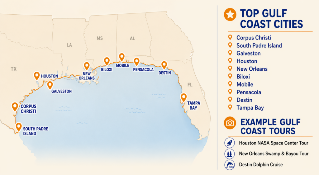 The Gulf Coast offers a distinct coastal experience shaped by calm emerald waters, barrier islands, and historic harbor towns along the northern Gulf of Mexico. Gulf Coast tours range from waterfront cities like Tampa Bay and New Orleans to beach destinations such as Destin and Pensacola, where fishing harbors, coastal parks, and maritime history define the character of the shoreline. Gulf Coast Tours vary by location. From Florida’s panhandle to quiet harbor towns, this shoreline carries a slower, saltier character shaped by tides, seafood docks, and generations of fishermen.