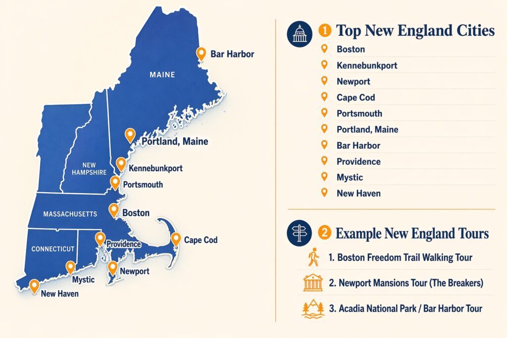 New England stretches from Connecticut’s harbor towns to Maine’s rugged coastline, blending New England tours’ maritime history, colonial architecture, and coastal culture into one of America’s most walkable and storied regions. From revolutionary-era cities to lighthouse-lined seaside communities, these New England tours explore the waterfront character, compact historic districts, and layered heritage that define the Northeast.